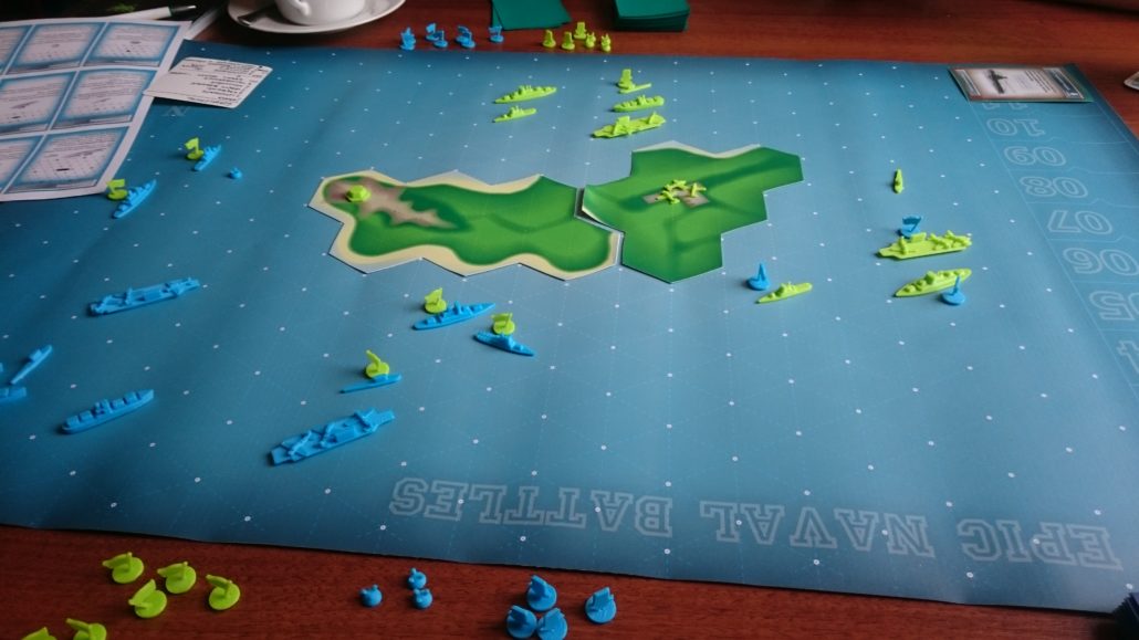 Podczas naszej rozgrywki, pod czujnym okiem autora, mieliśmy możwliość rozegrania jednego scenariusza o nazwie „Guadalcanal”, którego głównym założeniem było dokonanie desantu wojsk alianckich na wyspie oraz zniszczenie umocnień artylerii na tejże. Dzięki prostym, wręcz intuicyjnym zasadom mogliśmy szybko rozpocząć rozgrywkę. Gra zaskoczyła mnie głębią taktyki za sprawą unikalnych atrybutów poszczególnych jednostek, ciekawie zaprojektowanemu systemowi aktywacji okrętów oraz używania kart taktyki. Siedząc przy stole byliśmy bardzo zaangażowani w rozgrywkę, która przypominała starcie dwóch szachistów. Co prawda zdarzały nam się chwilowe klincze, gdy nasze jednostki trzymały się wzajemnie w szachu, jednakże sytuacja ciągłego napięcia powodowała iż szybko staraliśmy się manewrować poza pole rażenia przeciwnej frakcji zastawiając sidła i licząc na potknięcie się przeciwnika… Gra trzymała w napięciu do ostatnich chwil i dała mi ogromną satysfakcję z rozgrywki.