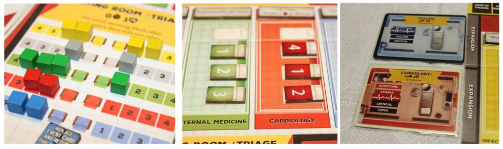 W grze nie brakuje też niekonwencjonalnych rozwiązań. Dla przykładu, pacjenci reprezentowani są na trzy sposoby – najpierw wkraczają do szpitalnej izby przyjęć, gdzie przedstawieni są w formie kolorowych kostek. Później, gdy zostaną przeniesieni na jeden z oddziałów szpitala kostki zamieniamy na żetony łóżek lub na żeton EKG gdy pacjent znajduje się na sali operacyjnej. Jednym wspólnym elementem jaki łączy te wszystkie inkarnacje pacjenta jest kolor, odpowiadający jednemu z pięciu rodzajów przypadłości trapiących pacjentów tj. choroby wewnętrzne, kardiologia czy psychiatria. Niezależnie od swojej lokacji, pacjent zawsze będzie przynależał do koloru odpowiadającej mu przypadłości.