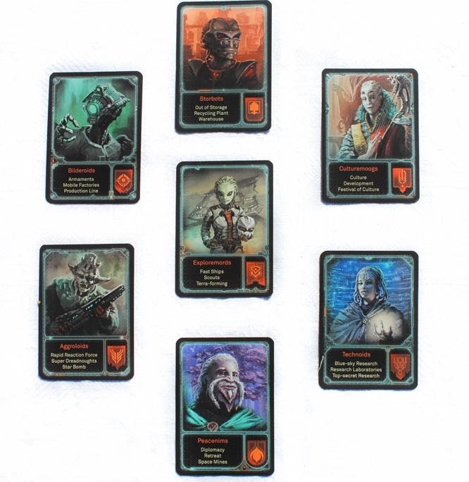 Siedem ras dostępnych w grze. Poza nazwą każdej znajdziemy także nazwy trzech pozostałych kart tworzących zestaw podstawowy danej rasy.