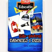 Dawniej i Dziś to 12 par ilustracji przedstawiających przedmioty, które różnią się diametralnie ze względu na czas, w którym powstały. Znajdziemy tu ilustracje przedstawiające m.in. samochody, przedmioty użytku codziennego tj. książki, instrumenty muzyczne, oświetlenie etc. Zestaw ten stanowi moim zdaniem najlepszą kopalnię wiedzy i ma największe spektrum zastosowań ze wszystkich dotychczas wydanych talii. My, dorośli doskonale pamiętamy jak wyglądały niegdyś samoloty czy statki w stosunku do ich współczesnych odpowiedników. Dzieci dorastające współcześnie niestety nie zrozumieją wielu aspektów dawnego życia (np. tego czym były kasety magnetofonowe i co je łączyło z ołówkiem;) ). Dzięki tej talii mamy punkt odniesienia do zainteresowania dziecka historią, a na jej podstawie do wyjaśniania wielu pokrewnych zagadnień. Dla przykładu na jednym zestawie kart widnieją ilustracje środków płatniczych, w tym kart kredytowych. Możemy dzięki nim wyjaśnić dziecku koncepcję pieniędzy oraz objaśnić współczesne metody dokonywania płatności. To oczywiście tylko jeden z przykładów. Zastosowań jest o wiele więcej.