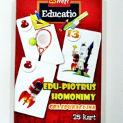 Jak wiadomo, homonimy to słowa, które określają więcej niż jedną rzecz, mimo że brzmią lub pisze się je tak samo. Do standardowych zasad Piotrusia dokładamy zasadę specjalną. Teraz aby zatrzymać skompletowaną parę kart należy podać jedno słowo, które trafnie opisuje oba obrazki z danej pary. Brzmi łatwo, prawda ? Jak się jednak okazuje, to zadanie to nie lada wyzwanie dla 3, 4 czy 5 letniego dziecka. Kolorowe rysunki tej talii przypadły jednak bardzo do gustu mojej córce, która nie mogła wyjść z podziwu, że dwie zupełnie inne rzeczy na dwóch kartach mają tę samą nazwę. Zabawa była naprawdę przednia, a córka potrafi obecnie prawidłowo wymienić kilka wyrazów łączących pary kart.