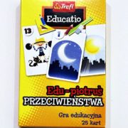 W przypadku tej talii zadanie jest bardzo proste. Musimy dobierać w pary antonimy, a odłożenie skompletowanej pary kart będzie możliwe dopiero, gdy nazwiemy je prawidłowo. Na kartach znajdują się atrakcyjne, kolorowe ilustracje, które tak samo jak w poprzednich zestawach można wykorzystać do gry w Piotrusia z dodatkiem opisanej powyżej zasady specjalnej lub jako pomoce naukowe u młodszych dzieci, dla których opanowanie przeciwieństw sprawiałoby problem. Talia może posłużyć także do nauki wymowy wyrazów w oparciu o przedstawione na kartach ilustracje.