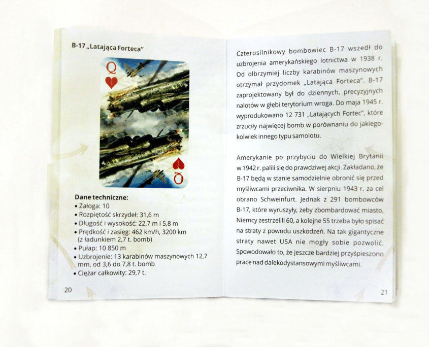 Jednakże dla osób, które nie są „trivia hunterami”, ciekawsza okaże się druga książeczka zawarta w pudełku z kartami. Jest nią komentarz historyczny, w którym znajdziemy informację o wszystkich postaciach, sprzęcie oraz wydarzeniach utrwalonych na ilustracjach zdobiących karty. Informacje te, choć przedstawione w dużym skrócie, stanowią ciekawy wstęp do nauki historii dla młodszych graczy, których mogą zaciekawić szczegóły techniczne najpopularniejszych samolotów, czołgów czy innych maszyn bojowych wraz z podsumowaniem ich zastosowania na polu walki, zasięgu, grubości pancerza itp. Dowiemy się także z kart broszury o postaciach dowódców armii Sprzymierzonych oraz charakterystyce samych armii, których ilustracje widzimy na blotkach.
