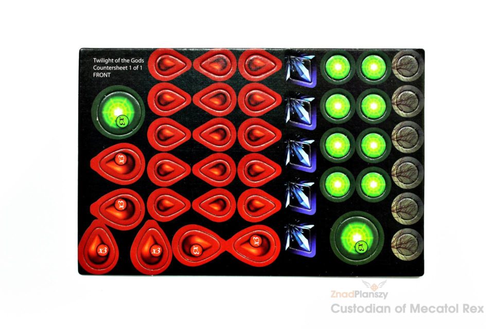 Żetony, są stosunkowo grube, mają żywe kolory i łatwo je wypchnąć z wypraski. Każdy z czterech rodzajów żetonów ma inne zastosowanie: czerwonymi w kształcie kropel krwi oznacza się obrażenia jednostek. Zielone to żetony błogosławieństwa podnoszące efektywność jednostek na których zostaną umieszczone. Niebieskie zaś mogą mieć różne zastosowanie, w zależności od efektów kart. Jednakże, ich podstawowym działaniem jest zapobieganie odświeżeniu karty na początku rundy. Ostatnie to żetony przywołania, które przedstawiają suche gałęzie (albo żyły wewnątrz ciała, w zależności od interpretacji). Wykorzystywane są w trakcie gry jako pomoce mnemoniczne, lub mówiąc prościej – przypominajki przy działaniu niektórych efektów kart.