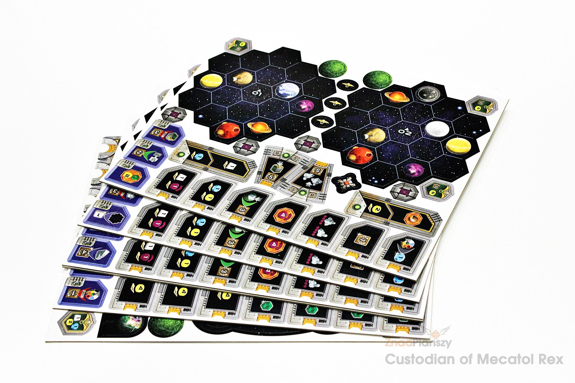 Po wyjęciu woreczków z pionkami i znacznikami zobaczymy planszetki graczy. To główny element gry, stanowiący dla gracza swoiste centrum dowodzenia własną rasą. Planszetki wykonane są z cienkiej, ale sztywnej tektury. Jest ich łącznie siedem, a na każdej stronie mieści się jedna rasa (łącznie jest ich 14, każda o innej charakterystyce i umiejętnościach). Osoby, które znają Terra Mystikę odnajdą tu znajome elementy, choć układ i wzornictwo symboli i grafik wydaje mi się bardziej funkcjonalne niż w oryginale. Ilustracje przedstawiające kosmiczne cywilizacje rysowane są w specyficznym stylu, który przypomina mi grafikę z gier komputerowych lat 90-tych i choć osobiście bardzo mi odpowiada, dla niektórych osób niewątpliwie stanowić będzie nabyty smak.
