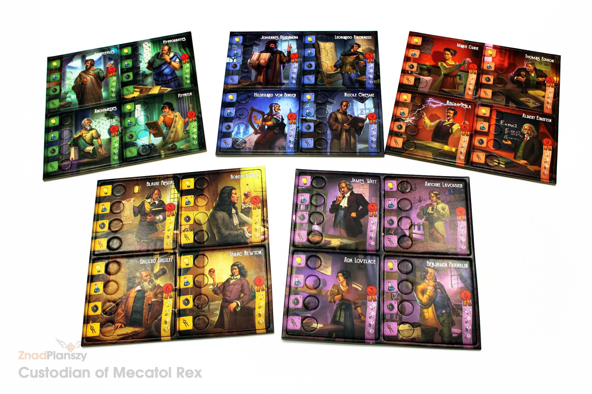 W środku pudełka zawartość szczelnie wypełnia przestrzeń dzięki tekturowej wyprasce. Najbardziej rzucającymi się w oczy elementami są wykonane z bardzo grubej tektury kafle przedstawiające wynalazców. Na każdym z nich jest piękna grafika przedstawiająca danego naukowca podczas pracy nad jego najbardziej znanym osiągnięciem. Kafle są w pięciu kolorach, które symbolizują kolor gracza oraz rozróżniają epoki w których żyli nasi bohaterowie. Po prawej stronie znajdziemy wymagania dotyczące rozwinięcia ich zdolności, które przyniosą nam punkty na koniec gry. Po lewej stronie natomiast mają symbole obrazujące umiejętności (fizyka, chemia, mechanika oraz matematyka), a przy każdym z nich jest wycięty otwór w które włożymy żetony wiedzy początkowej oznaczające biegłość w każdej z dziedzin. W trakcie gry będziemy dokładać w te miejsca kolejne by rozwijać naszych wynalazców. Niestety żetony nie mieszczą się w pełni w sytuacjach gdy zachodzi potrzeba włożenia ich czterech przy jednej umiejętności. Jednakże jest to rzadki przypadek i przez wzgląd na dużą grubość kafli, dodatkowe powiększenie otworów miałoby wątpliwy sens.