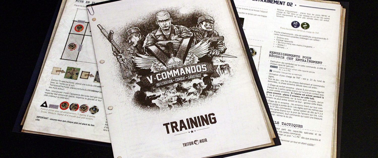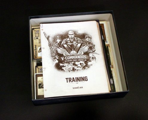Gra V Commandos oferuje kilka trybów rozgrywki. Bawić możemy się nie tylko przy kampanii, ale także rozgrywając pojedyncze misje. Do przygotowania jednych i drugich posłużą nam podłużne karty w rozmiarze Tarota (70x120mm). Przedstawiają one kampanie, poszczególne lokacje oraz zasady specjalne. Kampanie na ogół będą wymagały od nas ukończenia szeregu lokacji w określonej kolejności, ale to właśnie te ostatnie stanowią klucz do regrywalności gry. Poszczególne karty terenów posiadają bowiem mapkę wraz z celami, jakie należy zrealizować aby ukończyć z powodzeniem daną lokację. Każdą z kart terenu można jednak traktować jako pojedynczą misję, której ukończenie powinno nam zająć ok 30-45 minut. Dzięki temu rozwiązaniu grę możemy rozłożyć w kilka chwil i rozegrać kilka szybkich scenariuszy danego wieczora albo ułożyć jeden teren w celu prezentacji zasad nowemu graczowi.