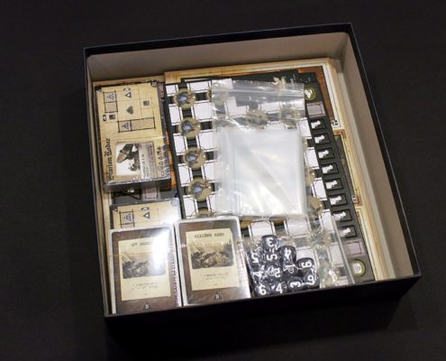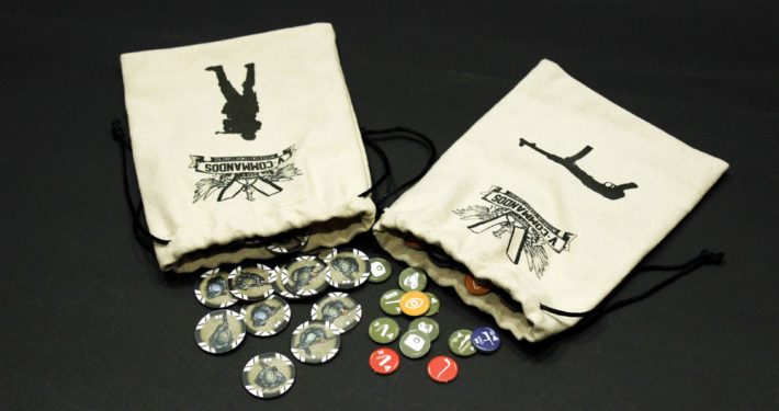 Ostatnim elementem są płócienne woreczki, które wydawca dołączył do przekazanej mi do recenzji gry. Niestety nie są one dostępne razem z grą i należy się w nie zaopatrzyć osobno, jednakże szczerze polecam to zrobić. Woreczki pomagają w losowaniu jednostek wroga oraz żetonów sprzętu. Ich rozmiar jest na tyle duży, że nie miałem problemu zmieścić do środka moich dużych dłoni, a skończywszy rozgrywkę, możemy bez przeszkód przechowywać w nich żetony, co pozwoli zaoszczędzić używania woreczków strunowych.