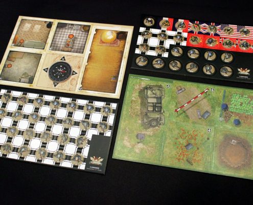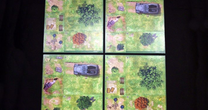 W grze nie występuje klasyczna plansza per se. Przestrzeń gry konstruujemy z płytek terenu, wzorując się na wspomnianej powyżej mapie. Kafelki z których będziemy konstruować tereny występują w trzech rozmiarach: mały kwadrat, prostokąt oraz duży kwadrat. Każda płytka jest obustronna, gdzie na jednej stronie przedstawiona wnętrza pomieszczeń, natomiast na drugiej tereny zewnętrzne. Wzory na kafelkach są stosunkowo generyczne, a tworząc teren powinniśmy się jedynie kierować rozmiarem płytem oraz ustawieniem wnętrze/plener. To co przedstawiają płytki na poszczególnej stronie nie gra roli, dzięki czemu układając wielokrotnie nawet tę samą planszę uzyskamy zupełnie inny teren, co także poprawia regrywalność gry. Jednym wspólnym elementem są okrągłe okręgi, nadrukowane na powierzchni każdego kafelka. Są to miejsca przeznaczone dla jednostek komandosów i przeciwników. Rozwiązanie to pozwala zachować czytelność kafla i przedstawionego na nim terenu, jednocześnie rezygnując z potrzeby umieszczania na kafelku heksagonalnej siatki ruchu (nie ma bowiem wpływu na którym polu postawimy żetony, całe pomieszczenie jest widoczne dla naszych jednostek, a te nie blokują sobie wzajemnie możliwości ruchu).