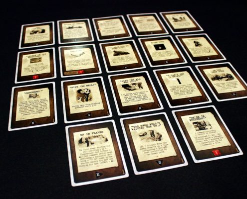 W grze co rundę będziemy ciągnąć karty z talii wydarzeń, z której – jak wskazuje nazwa, dowiemy się jakie warunki będą panować podczas najbliższych kilku tur graczy. Karty te posiadają standardowy rozmiar i bez przeszkód zmieszczą się w standardowych protektorach dla kart CCG. Same karty wykonane są ze sztywnej tektury o dobrej jakości. Na większości z nich znajdziemy zdjęcie nawiązujące w jakiś sposób do wydarzenia opisanego na karcie, a także stronę świata z tarczy kompasu wskazującą kierunek w jakim przemieszczą się wrogie jednostki, gdy nadejdzie ich faza ruchu.
