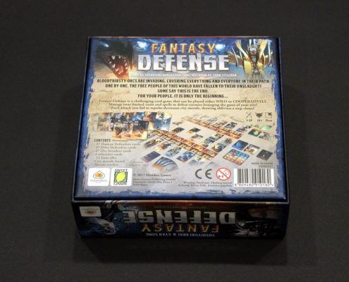 Fantasy Defence to niewielkich rozmiarów gra karciana przeznaczona dla 1 – 2 graczy, której motywem przewodnim jest obrona miasta przed oblegającą go armią orków. Gracze wcielą się w obrońców reprezentujących armie ludzi bądź elfów, a w trakcie rozgrywki zarządzali będą ograniczonymi zasobami, starając się odeprzeć kolejne fale wrogiej armii nacierającej na siedem bram oblężonego miasta. Fantasy Defence jest bowiem grą należącą do gatunku Tower Defence – rodzaju gier spopularyzowanych przez aplikacje na telefonach czy tabletach, w których gracz dysponując ograniczoną liczbą jednostek musi rozlokować je w kluczowych miejscach, aby zapewnić sobie optymalną obronę pomiędzy kolejnymi, przybierającymi na sile falami wrogich jednostek atakujących jego pozycje.