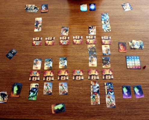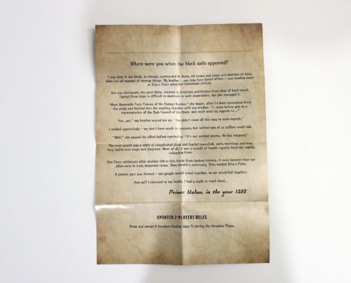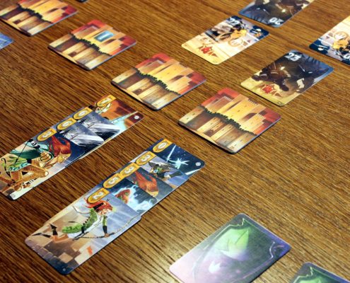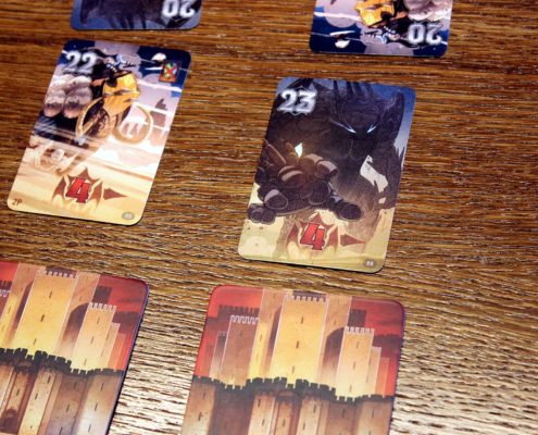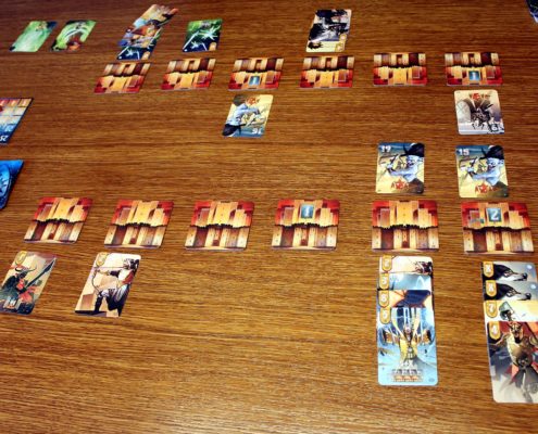 Jedną z zalet, które warto wymienić na starcie i które zaliczam jako jeden z plusów tej gry, jest krótki jak na grę karcianą czas przygotowania. W zależności od tego czy gramy samodzielnie czy z partnerem, przygotowanie gry sprowadza się do wyboru frakcji – ludzi bądź elfów. Z wybranej talii pobieramy trzy z góry określone karty, a następnie tasujemy ją i dociągamy jeszcze cztery, które wraz z wcześniej pozyskanymi kartami stanowić będą naszą początkową rękę. Przygotowanie talii najeźdźców jest odrobinę bardziej złożoną czynnością, gdyż składać się ona będzie z dwóch kart bossów oraz kart elitarnych i podstawowych jednostek, odpowiednio rozmieszczonych w narastającej pod względem trudności kolejności (każdy z poziomów trudności posiada jednak inny rewers kart, dzięki czemu łatwo odnajdziemy je w talii). Dodatkowo, w przypadku gry w pojedynkę, musimy także pamiętać o usunięciu z talii najeźdźców określonej liczby kart, ale te, podlegające usunięciu na szczęcie są odpowiednio oznaczone. Następnie tak przygotowaną talię najeźdźców umieszczamy w środkowej części stołu, a pomiędzy nami, a kartami najeźdźców kładziemy 7 kafelków z bramami miasta. Ostatnią czynnością jest ustawienie pionka na 20 polu planszetki, za pomocą której będziemy śledzić morale mieszkańców miasta.
