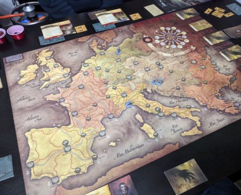 A skoro mowa o pandemii, dwa lata temu na polskim rynku ukazała się za sprawą wydawnictwa Lacerta wersja Pandemica, w której zamiast rozprzestrzeniających się chorób, gracze starali się będą nie dopuścić do przebudzenia Wielkich Przedwiecznych i ocalić świat przed szaleństwem i chaosem w jakie zapanują, jeśli licznym kultystom uda się ich mroczny plan. Pandemia: Czas Cthulhu łączy motywy powieści mistrza grozy, Howarda Philipsa Lovecrafta z mechaniką popularnej Pandemii, więc zamiast leczyć choroby, będziemy starali się zamknąć cztery bramy wiodące do straszliwych, obcych wymiarów. Podczas gry rozwija się wyczuwalne napięcie, gdyż poza utratą zmysłów naszych poszukiwaczy w grze można przegrać także na kilka innych sposobów. Zwycięstwo wymagać będzie zatem od graczy pełnej współpracy, a sama wygrana i uratowanie świata przed Przedwiecznymi (przynajmniej mi) sprawia o wiele większą frajdę niż wynalezienie szczepionki na gruźlicę 😉
