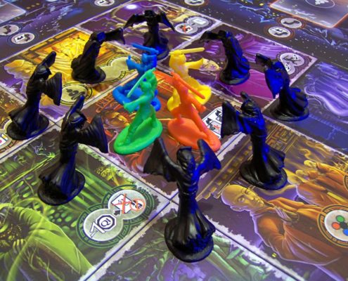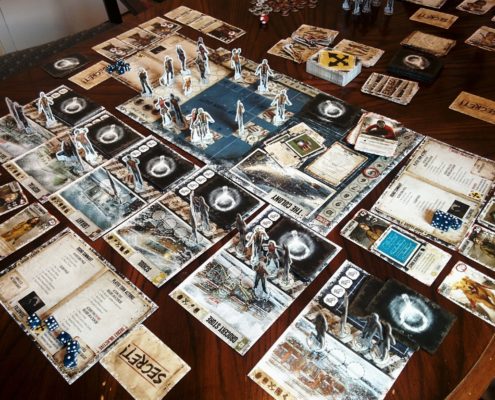 Niniejsze zestawienie zamykam dosyć sporą grą, zarówno pod względem fizycznego rozmiaru jak i tematu. Cthulhu Wars to gra strategiczna, w której gracze wcielają się w Przedwiecznych – mityczne stworzenia z kosmosu i innych wymiarów, znane z tzw. mitologii Cthulhu, stworzonej przez H. P. Lovecrafta. Gra opowiada historię o tym, co się stanie, jeśli gracze zawiodą podczas rozgrywek w Posiadłość Szaleństwa, Horror w Arkham czy inne gry osadzone w tym uniwersum, o których pisałem wcześniej w niniejszym zestawieniu. Wielcy Przedwieczni zbudzili się i sprowadzili na świat zagładę. Teraz toczą walkę między sobą o panowanie nad tym, co pozostało z ludzkości. Gra stawia nas więc w roli niejako samych przedwiecznych, a w trakcie rozgrywki będziemy wykorzystywali naszych kultystów oraz przyzwane przez nie monstra do przejmowania kontroli nad kolejnymi rejonami blogu. Wyobraźcie sobie zatem Ryzyko, ale z użyciem wielkich, 18cm figurek Cthulhu, Hastura i innych bóstw z panteonu mitycznych stworów Lovecrafta. Tytuł doskonale nadaje się na epickie zakończenie imprezy halloweenowej. Pamiętajcie tylko, aby nie odczytywać inskrypcji z kart zbyt głośno, aby niechcący nie otworzyć prawdziwego portalu do innego wymiaru 😉