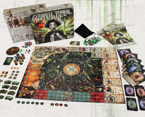 Jeśli zimne ulice Londynu są wam nie w smak, może lepiej wybrać się w innym kierunku? Wenecja od lat cieszy się popularnością wśród turystów. Słynne kanały, gondole, klasyczna architektura… i zastępy zombie przemierzające wąskie uliczki. Podczas tej wyprawy do miasta na wodzie naszym celem nie będzie dotarcie do Wenecji, co ucieczka z niej na stały ląd. Miasto opanowały bowiem ożywione zwłoki, które całymi dziesiątkami wychodzą z wody i pożerają spanikowanych turystów. Wszystko to za sprawą mitycznego Lewiatana, na którego grzbiecie wybudowano miasto wieki temu, a który właśnie się przebudza. Gracze mają zaledwie kilka dni i nocy na ucieczkę z miasta, nim zniknie ono w morskich głębinach, a gracze dołączą do armii nieumarłych, przyzwanych przez Lewiatana potworów. Carnival Zombie stanowi jedną z mniej znanych na naszym rynku gier euro, a same zombie są w niej przedstawione za pomocą kolorowych kosteczek, niczym w grze Felda. Niemniej jednak, tytułem tym warto się zainteresować, a podczas rozgrywki w Halloween, zamiast klasycznych przebrań możecie do stołu zasiąść w pełnych, klasycznych strojach karnawałowych i założyć znane weneckie maski 😉