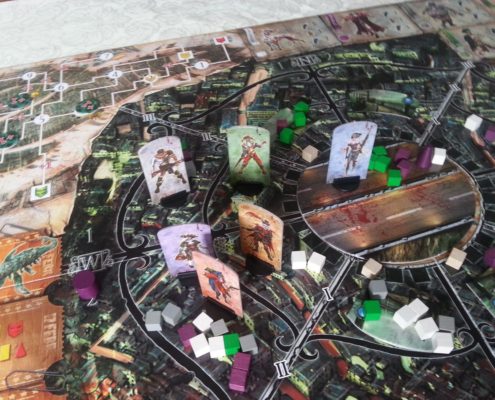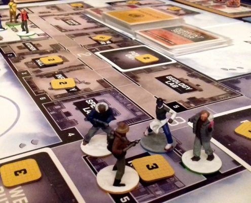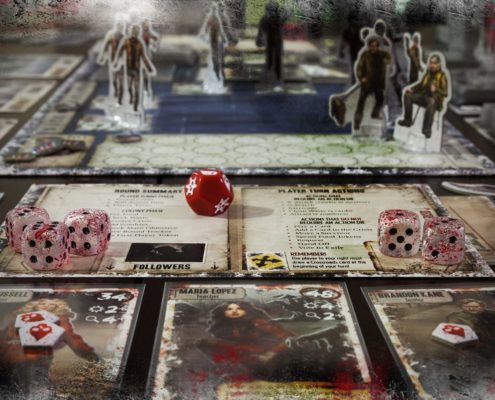 W odróżnieniu od Zombicide, w którym rozgrywkę cechuje silna współpraca pomiędzy graczami, w serii gier City / Mall of Horror przetrwanie bohaterów niejednokrotnie będzie wymagało poświęcenia jednego lub kilku postaci – niezależnie od tego, czy podoba się to sterującym ich graczom, czy nie. Rozgrywka obnaża tu prawdziwą naturę człowieka, który zrobi wszystko, aby przetrwać – nawet poświęcając innych żyjących aby samemu uciec od śmierci. Podczas gry, jej uczestnicy będą wędrować po zniszczonym centrum handlowym lub mieście (w zależności od części gry), starając się znaleźć sprzęt, zapasy i schronienie w trakcie szalejącej dookoła pandemii zombie. Przetrwają tylko najsilniejsi, a jako że zapasów z biegiem rozgrywki będzie coraz mniej, gracze będą odbywać głosowania nad tym, kogo poświęcić w krytycznym momencie lub gdy zombie przebiją się przez barykady. To właśnie ten element gry podoba mi się w niej najbardziej. Czy w podbramkowej sytuacji stawimy dzielnie opór nieumarłym, czy też rzucimy im na pożarcie swych towarzyszy? Choć jak na dzisiejsze standardy, brak figurek może niektórym przeszkadzać, to gry z tej serii zapewniają naprawdę dużo dobrej zabawy, podchodząc do tematu przeżycia apokalipsy zombie z jednej strony na wesoło, a z drugiej… No właśnie. Jeśli myśleliście że Gra o Tron kończy przyjaźnie, to jakie wrażenie zrobi na was wieloletni przyjaciel, który rzuci was prosto na gromadę rozwścieczonych ożywionych trupów byle tylko uciec z zbieranymi przez was zapasami 😉