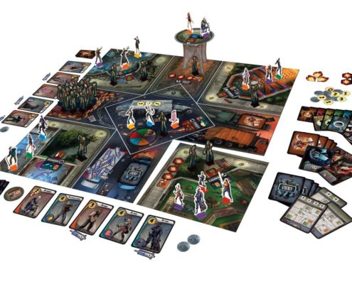 Kolejny tytuł, kolejna fala zombie. A one już tak mają, że lubią nacierać falami i w tej grze nieuwaga graczy może sprawić, że utoną oni pod kolejną… falą nieumarłych. Żarty, żartami. Zombicide nie trzeba dziś już chyba nikomu przedstawiać. Na przestrzeni ostatnich lat gra ukazała się na naszym rynku w różnych odmianach tematycznych – od współczesnej po średniowieczną Black Plague od Portal Games. Rozgrywka oferuje graczom możliwość wcielenia się w różne, najczęściej inspirowane pop kulturą postaci, których celem będzie ucieczka z planszy, na której roić się będzie od zastępów nieumarłych. Wykonując kolejne zadania i przeszukując lokacje, gracze będą eksterminować kolejne fale zombiaków, efektem czego będzie rosnący poziom doświadczenia ich postaci, a wraz z nim kolejne odblokowane umiejętności, z pomocą których łatwiej będzie rozprawiać się z nieumarłymi. Sęk w tym, że wraz ze wzrostem doświadczenia u postaci wzrasta także poziom trudności samej gry. Aby mieć szansę na przetrwanie, gracze będą musieli z rozwagą planować ruchy i dbać o równomierny rozwój swych bohaterów, aby nie utrudniać zabawy postaciom na niższych poziomach rozwoju. Aczkolwiek, proste zasady i niezobowiązujący charakter rozgrywki sprawiają, że zawsze znajdzie się ktoś, kto z szalonym okrzykiem ochoczo rzuci się w pojedynkę na gromadę zombie, uzbrojony jedynie w patelnię.  Jeśli więc planujecie, aby wasza halloweenowa impreza miała nieco lżejszy charakter, rozgrywka w Zombicide zdecydowanie dobrze idzie w parze z pogawędką przy piwie lub innym trunku.