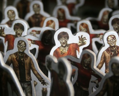 Halooween to nie tylko klasyczne potwory jak duchy, wilkołaki czy wampiry. Od kilku lat nieprzerwanie trwa moda na Zombie – bezmyślne ożywione trupy, których jedynym pragnieniem jest dobrać się do naszych mózgów (ich największy przysmak). Ich pierwsza fala uderza nas w tym zestawieniu za sprawą gry Martwa Zima. Dotychczas na naszym rynku pojawiły się dwie części tej gry, w trakcie której gracze wcielają się w grupę ocalałych ludzi, którzy ukryli się w magazynie i starają się przetrwać apokalipsę Zombie. Gra klimatem bardzo przypomina serial Żywe Trupy (The Walking Dead). Każdy z graczy stara się realizować ogólne cele scenariusza, aczkolwiek konwencję klasycznej kooperacji przełamuje tu motyw zdrajcy – nie wszystkim bowiem może zależeć na dobru ogółu i aby wygrać, będą oni realizowali swe własne ukryte cele. Atmosferę grozy dopełniają tutaj ciężkie wybory związane z kartami rozdroży – wydarzeń mających wpływ na rozgrywkę, zawierających także klimatyczne opisy. Przy odpowiedniej ekipie grając w ten tytuł poczujemy się, jakbyśmy sami byli bohaterami odcinka serialu o pandemii zombie.
