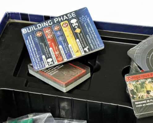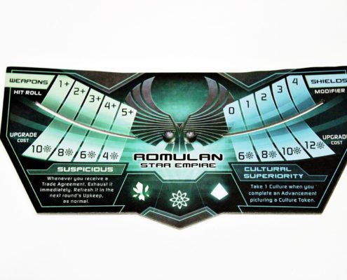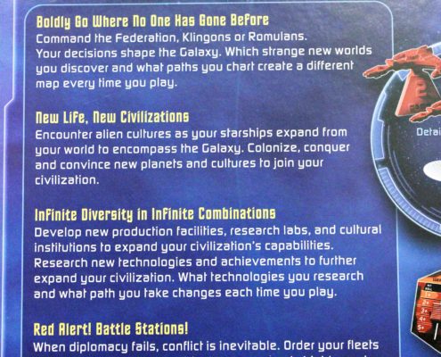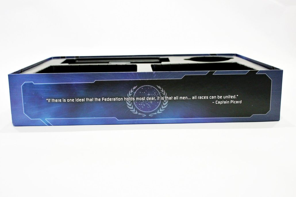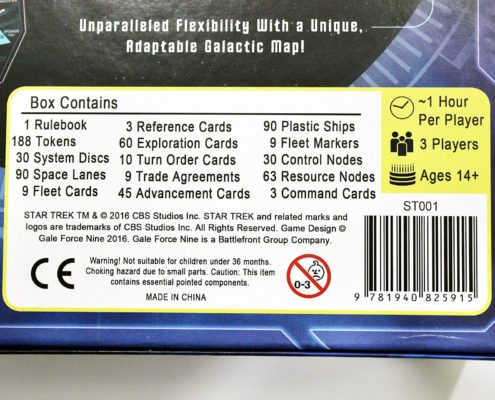 The sides of the box, apart from the title of the game and Gale Force Nine’s logo, one will also find the depictions of spaceships of each of the three civilizations present in the game. They are the Klingon Vor’Cha class cruiser, a Romulaian Warbird and the legendary Enterprise-D – Starfleet’s flagship ship from the second half of the twenty-first century, commanded by Jean-Luc Picard.
