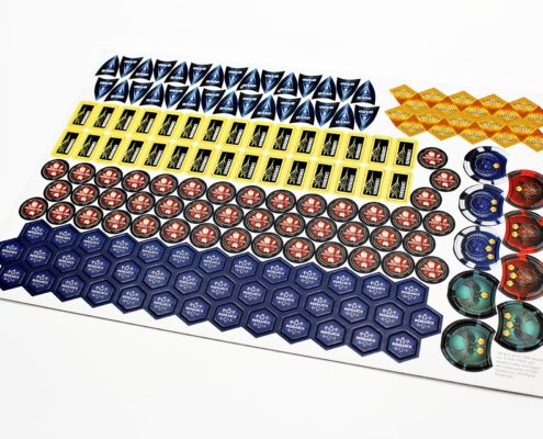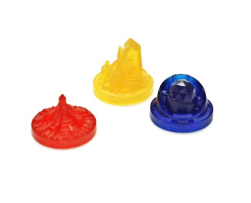 Players will mark their presence in a system not only by means of ships present there. Control of systems is indicated by means of control nodes that can be put on an uninhabited system with one of the actions available in the game. In subsequent rounds, we will be able to build appropriate nodes which produce raw materials in the systems we control. These are presented with transparent markers in red, yellow and blue. Each of these nodes produces a different type of raw material, which come in three types in the basic game.