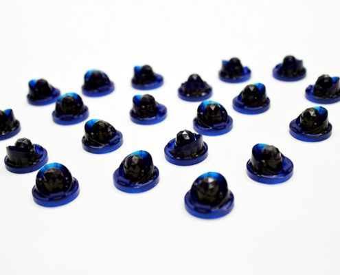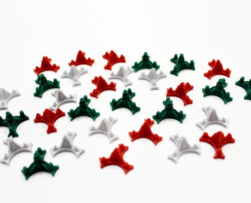 The game could not go without dice! The box contains a set of 10 standard, blue-colored six-sided dice and one slightly larger, used to determine the length of the warp tunnels. These cubes do not stand out as anything special, but the publisher has also sent me three sets of dice intended for particular factions. In addition to the color corresponding to each faction, the cubes also have the symbols of their empires. Thanks to this, each of the participants of the game has their own set of personalized dice to play with, which will not only affect the aesthetic value, but will avoid the need for players to share and re-roll the dice during combat. These dice are just one of many accessories that you can enrich your copy of the game with. The publisher’s offer also includes plastic sets of space stations that will replace the cardboard tokens in the game. You can also buy additional sets of spacecraft, with the help of which we will be able to build larger fleets (especially useful in games which involve higher player countss), not to mention more dice sets for each of the races found in the expansions.