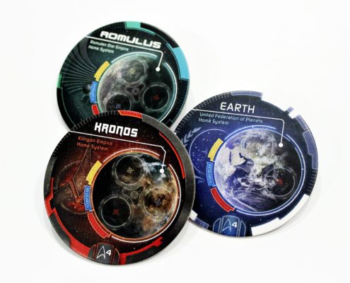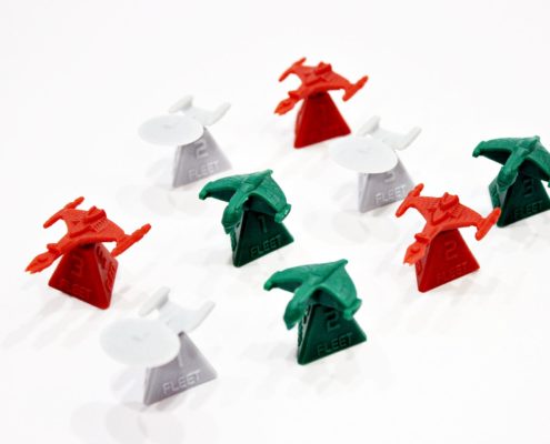 In the game, we will also deal with many plastic spacecraft miniatures. For the Federation, these will be models of the Galaxy class ships (Enterprise-D), Klingons will travel across space in Vor’cha cruisers whilst Romulans shall sow fear in their cloacking-capable Warbirds. The models are relatively small, but for convenience, as well as for the performance of specific functions during the game, you will be able to combine them into fleets, marked on the board with a slightly larger model of a given ship, placed on the base with a digit denoting a specific fleet. The models themselves are characterized by a large number of details for their small size, so more talented hobbysts will be able to successfully paint the ships to increase the visual experience, and thus the satisfaction drawn from playing with painted ships.