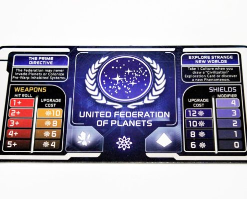 As befits aa Ameri-style board game, the visual side of the components is kept in the convention of the TV series. The players’ game boards resemble command consoles that could be found on the ships of civilizations presented in the game. In the case of Klingons, the immersion is so deep that the descriptions of functions on the board have been translated into Klingon (how cool is that!?). Command panels also have grooved tracks in which players place plastic sliders for statistics, but I will write more about this in the upcoming review.