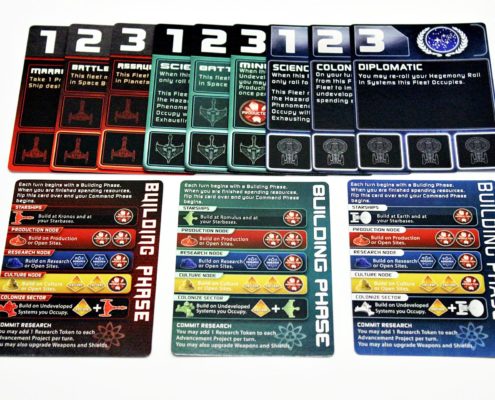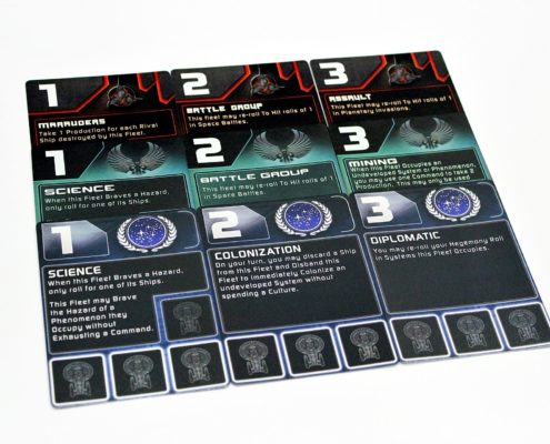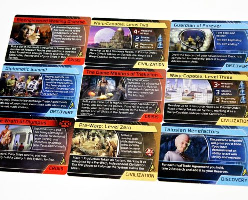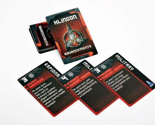 In Star Trek Ascendancy there are also many components made of thinner cardboard – the cards. Among them, you can distinguish several types of cards in different sizes, i.e. trade agreements, player turn cards or exploration cards, all of which are in the Standard CCG size. Smaller, technological advancement cards or the largest of them all – the player fleet cards. Again, all types of cards are made with the utmost attention to detail. Color saturation is appropriate, I also did not find any printing errors or offsets with the die. Everything looks just right.