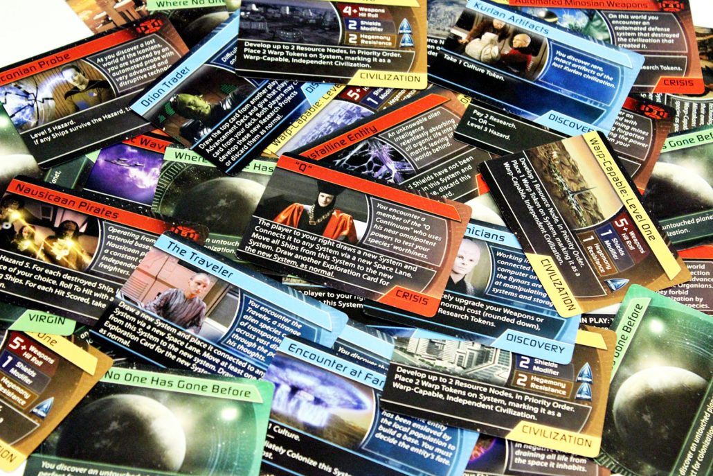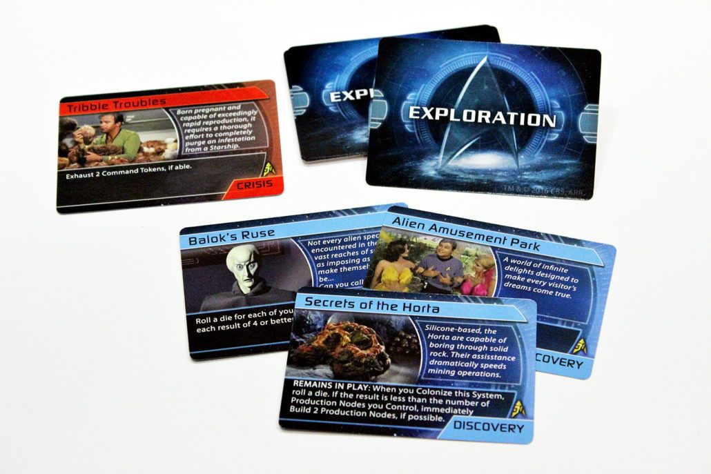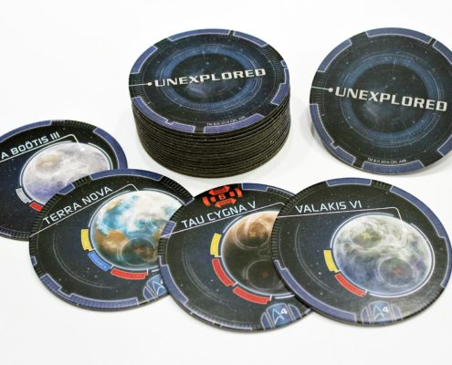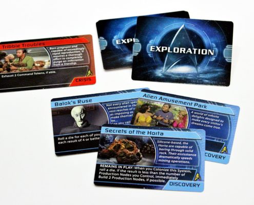The last component made of thick cardboard are the round tiles depicting planets. It is through them that the players will create a game board by combining the newly added systems with the above mentioned subspace corridors. Fans of the series probably recognize such planets as Janus VI, Deneb V or Rura Penthe. To the delight of the fans, both the planet tiles and the exploration cards discussed below contain places and events from all previous TV series. Therefore, I am very happy that the authors of the game took full advantage of the entire welth of the Star Trek universe, including the less popular shows such as Enterprise.