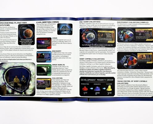 The instruction manual is printed on smooth chalk paper and the rules of the game are layed out in it on 30 pages, richly illustrated with graphics. However, these are not ordinary drawings which illustrate a particular rule. On many pages we find photos from all of the up to dae TV series (because the game has been released in 2016, there are no references to Star Trek Discovery, thoguh). The publisher has also added two leaflets promoting future expansions to the game: the Cardassian and Ferengi empires, thanks to which additional players will be able to participate in the game. There is also a leaflet with a game code for Star Trek Online.