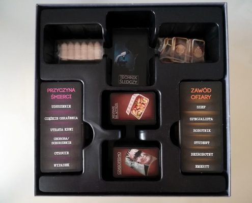 W przypadku tego tytułu chodzi bardziej o przygotowanie Miejsca Zbrodni. Na początek zaczynamy od rozdania wszystkim graczom po cztery karty Tropów i tyle samo Metod. Detektywi rozkładają je przed sobą, w kierunku innych, tak aby każdy miał swobodny dostęp do ich treści. Teraz mamy chwilę czasu, żeby zapoznać się z kartami każdego gracza z osobna. Następnie przechodzimy do przetasowania tożsamości i rozdania ich. Nadmiarowe karty odkładamy do pudełka, nie będą brały udziału w dalszej zabawie. Przyszedł czas na poznanie naszych ‘alter ego’.  Chyba nie muszę przypominać, że robimy to tajnie przed innymi graczami? Jedyną osobą, która się w tym momencie ujawnia jest Technik Śledczy. Odkłada swoje karty Tropów i Metod i od tej chwili jego ‘narzędziem pracy’ będą Kafle Poszlak. Na koniec rozdajemy Żetony Odznak, symbolizują one próbę rozwiązania śledztwa, są jednorazowego użytku. Detektyw ma tylko jedną próbę, aby udzielić poprawnej odpowiedzi, co oczywiście nie dyskwalifikuje go z dalszej rozgrywki w momencie błędnego wskazania kart. Tak przygotowani możemy rozpocząć dochodzenie!