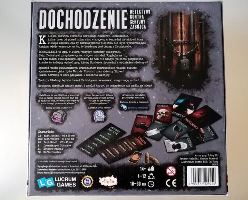 Brzmi klimatycznie, prawda? Cóż w instrukcji również znajdziecie klimatyczne wprowadzenie, ale muszę was zaskoczyć, bowiem ta wersja gry w „kryminalnych” klimatach zupełnie się różni od takich tytułów jak „Kroniki Zbrodni”, czy „Detektyw”. Wymienione pozycje szturmem weszły na półki sklepowe w ostatnim kwartale ubiegłego roku i w bardzo krótkim czasie zyskały dużą popularność. Jednak to, co je łączy to temat, ponieważ każda z nich stanowi zupełnie inny tytuł bazujący na różnych mechanikach. W „Kronikach Zbrodni” wykorzystujemy aplikację, za pomocą której odczytujemy QR-kody z kart, w „Detektywie” posługujemy się specjalnie dedykowaną stroną internetową, natomiast w „Dochodzeniu”… wystarczy, że zbierze się duża ekipa zgranych znajomych, która nie boi się storytellingowych tytułów. Zapraszam was na kryminalną przygodę w imprezowym wydaniu.