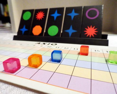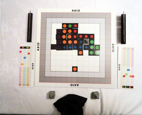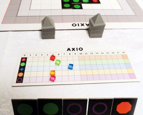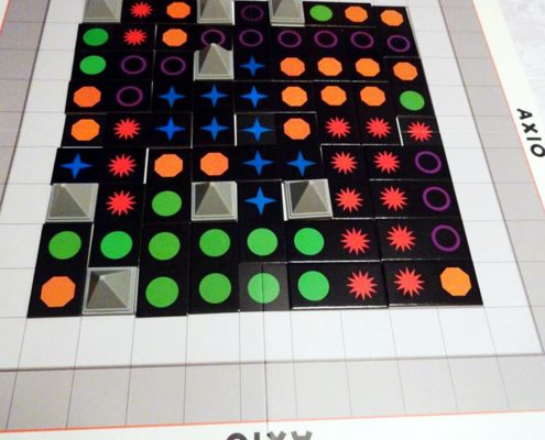 Ciężko jest ocenić ten tytuł i choć trochę nie nawiązać do „Geniusza”. Zdecydowanie ma on lepszą okładkę, bo niestety „Axio” świeci pustkami. Przechodząc jednak do ważniejszych kwestii, czyli mechaniki, mamy kilka subtelnych zmian, które nieco zmieniają rozgrywkę. Największą z nich są piramidy, których wcześniej nie było. Można nadrobić sporo punktów dobrze wykorzystując sytuację na planszy. Jednocześnie staramy się pilnować przeciwników, którzy też chcieliby je postawić i zapunktować. Na korzyść „Axio” przemawiają także dodatkowe elementy gry, które wcześniej zostały wtopione w główną planszę – tory punktacji i podstawki pod płytki. Będziemy potrzebowali trochę więcej miejsca na stole, ale wygoda podczas rozgrywki jest nieporównywalnie większa. Jeśli chodzi mniejszą ilość symboli oraz zmianę kształtu płytek, a więc i mniejszą liczbę rzędów, z których można zdobywać punkty, to ciężko wytypować, która gra będzie lepsza. Wydaje mi się, że to już kwestia indywidualna i warto zagrać w obie, aby wyrobić sobie zdanie. U mnie w hierarchii „Axio” stoi nad „Geniuszem”, głównie z powodu lepszej organizacji toru punktacji i podstawek oraz obecności piramid, które uatrakcyjniają rozgrywkę o nowy element w naszej strategii.