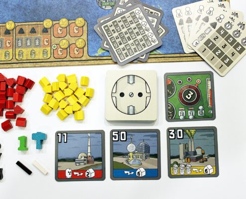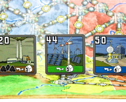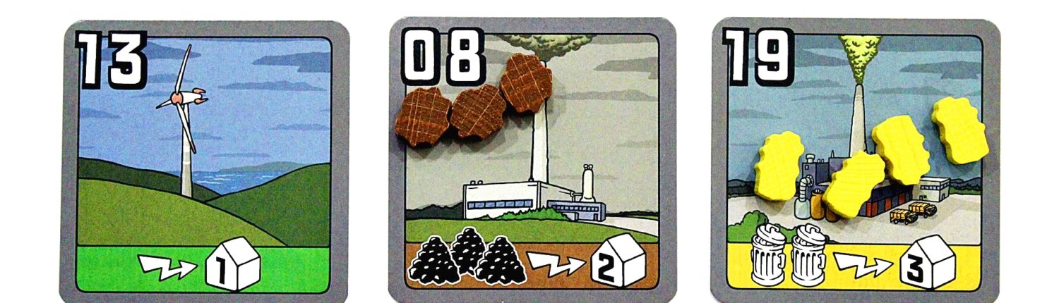 W pudełku znajdziemy również dużo kart, z czego większość prezentuje elektrownie, które będziemy mieli okazję zakupić. Dzielą się one na sześć rodzajów w zależności od surowca, jakim są zasilane. Cztery podstawowe zasilane są węglem, olejem, odpadami i uranem. Kolejnym typem są elektrownie hybrydowe, które mogą być zasilane zarówno węglem, jak i olejem. Ostatnim rodzajem są elektrownie na energię odnawialną, które dodatkowo dzielą się jeszcze na zasilane wiatrem i geotermią. W lewym górnym rogu każdej z nich znajduje się numer, który przedstawia ich minimalną cenę podczas licytacji. Na spodzie pokazana jest ilość surowców potrzebnych do ich uruchomienia oraz liczba stacji transformatorowych, które jest ona w stanie zasilić. Nowością są rewersy najtańszych kart, które jako pierwsze pojawiają się w grze. Oznaczone zostały wtyczką w kontakcie, co łatwo pozwala je rozpoznać i przyśpiesza przygotowanie rozgrywki. Pozostałymi kartami są pomoce dla graczy oraz nowo wprowadzone karty pokazujące ilość zasobów, jakie co rundę będą trafiać na rynek.