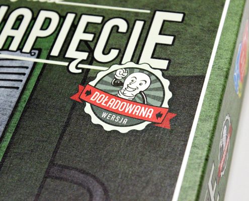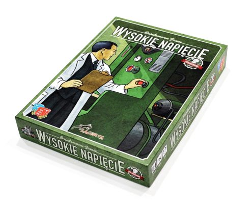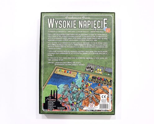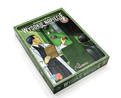 Na pierwszy rzut oka utrzymane w zielonej tonacji pudełko Wysokiego Napięcia niczym nie różni się od poprzedniego wydania. Grafika na okładce przedstawia inżyniera w białym fartuchu obsługującego szafę sterowniczą jakiegoś urządzenia. Styl jej wykonania wyraźnie odbiega od dzisiejszych tytułów, jest dość prosta, mało szczegółowa oraz dominuje na niej jedna barwa. W żaden sposób nie zmieniła się względem pierwotnej wersji sprzed piętnastu lat. Pewnie niektóre osoby będą narzekać, że nie została odświeżona, bądź narysowana od nowa, ja uważam natomiast pozostawienie jej bez zmian za zaletę. Według mnie posiada swój klimat i przywołuje wspomnienia z dawnych rozgrywek. O tym, że mamy do czynienia z nowym wydaniem świadczy jedynie znaczek w górnym prawym rogu pudełka oraz na każdym z jego boków, a także opis gry na spodzie.