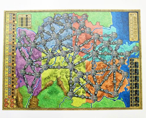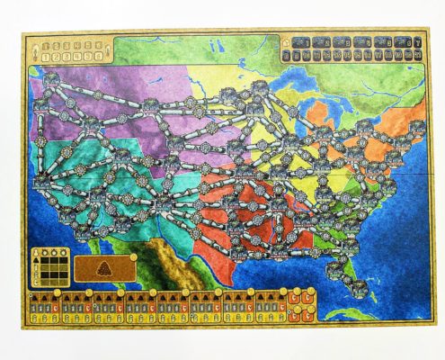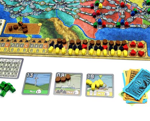 Zmiany na planszy widać natomiast po reszcie umieszczonych na niej elementów. Został dodany drugi tor kolejności graczy, co ułatwia kontrolę nad nią. Na rynku paliw przy dolnej krawędzi planszy, gwiazdkami pokazane zostały początkowe ilości surowców, z którymi zaczynamy rozgrywkę. Nieco wyżej wyznaczone jest miejsce na specjalną kartę, przedstawiającą ilość uzupełnianych co rundę surowców na rynku. Bardzo spodobał mi się ten pomysł, gdyż wyeliminował konieczność zaglądania co rundę do instrukcji. Dodatkowo, na mapie USA umieszczono obszar składu węgla, z którego można kupować go po maksymalnej cenie, gdy nie jest już dostępny na rynku. Jedynie tor wielkości sieci w prawym górnym rogu, na którym zaznacza się ilość posiadanych stacji transformatorowych pozostał bez zmian.